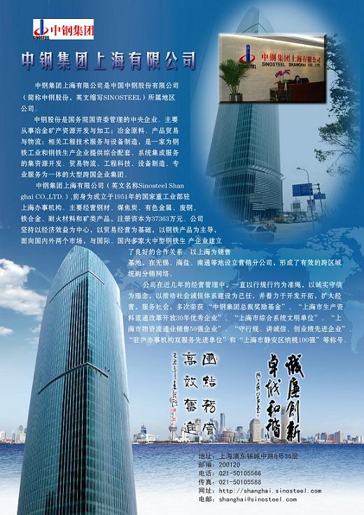 中国中钢集团公司是国务院国资委管理的中央企业,是一家为钢铁工业和钢铁生产企业提供综合配套、系统集成服务的集资源开发、贸易物流、工程科技、设备制造、专业服务为一体的大型跨国企业集团,位列2010年世界企业500强第352位,中国企业500强第32位。中钢集团上海有限公司作为中钢集团所属重要子公司,主要从事钢材、矿石、铁合金、耐火材料、有色金属、废旧金属、煤焦炭等商品的内外贸业务。公司以品种、质量、价格、服务的优势和资信信誉取信于市场,连续多年被评为“上海市流通企业销售、利润五十强”企业。