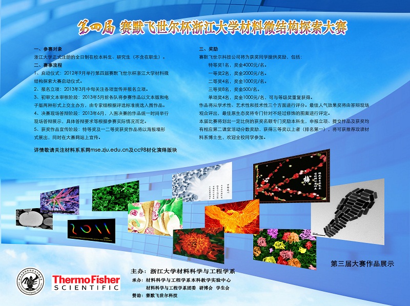 浙江大学材料科学与工程学系定于2012年12月至2013年6月举办第四届赛默飞世尔杯浙江大学材料微结构探索大赛,具体赛程如下: