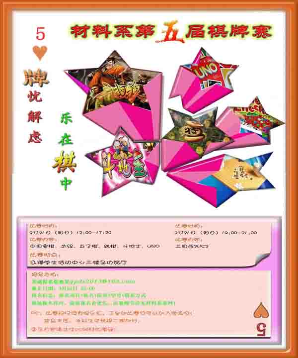 ⑸UNO:根据报名人数,分4—6为一组,每组每轮进行两局比赛,计分最少的半数晋级,直至决赛局决出前6名。