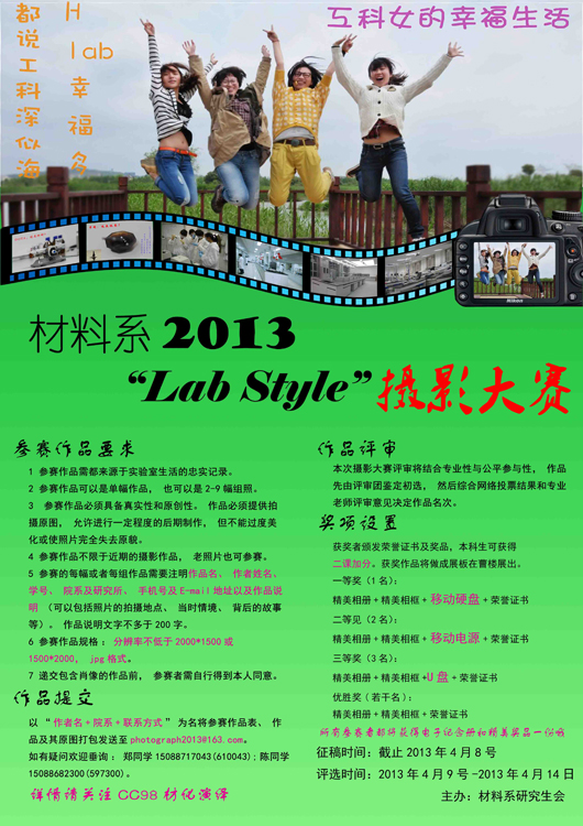 为了丰富在校师生的精神文化生活,引导同学们用相机记录实验室的点点滴滴,体现实验室生活的丰富多彩,给爱好、擅长摄影的老师同学提供学习、交流、展示的平台,材料系举办主题为“Lab Style”的摄影大赛,现向大家征集摄影作品。
