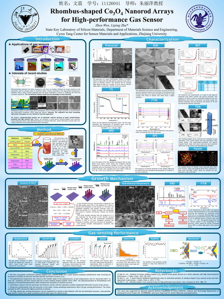 2、内容丰富:Poster的内容涵盖了材料应用背景、合成过程与生长机制、多种手段微观组织结构分析、气敏特性表征等方面,是完整的研究总结。