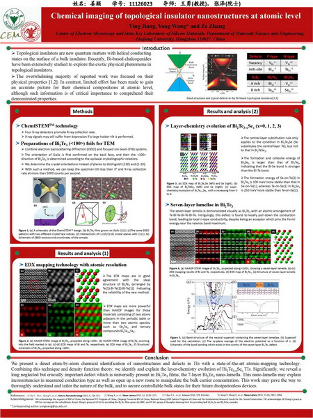 拓扑绝缘体是一种新型量子材料,具有很多新奇的物理现象。目前大多数研究都集中在拓扑绝缘体的物理性能,很少有人探讨其精细微观结构。作者设计了一种原子映射技术,并结合密度泛函分析,在原子级层面上研究了Bi2Te3等拓扑绝缘体的微观结构。揭示了层间化学成分演变,发现了一种新的7层结构缺陷,证明了其堆垛顺序,并研究了其能带性质,该7层结构缺陷为受主,但可使导带下移,具有令人惊奇的特性。这一工作对拓扑绝缘体领域的研究起到了积极的推动作用,相关成果已发表在Nano Letters上。这份Poster版式设计合理美观,内容编排丰富而简洁,作者现场陈述思路清晰,能够正确而深入地回答评委提问。综合来看,本Poster非常优秀。
