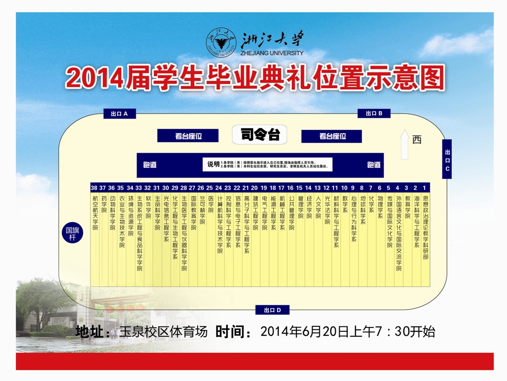各位同学: 2014届学生毕业典礼6月20日(星期五)上午7:30在玉泉校区大操场举行,6月21日(周六)第三批参加学位授予仪式。现将有关事项通知如下: 1. 毕业典礼 要求每位毕业生参加毕业典礼,着装整洁,并于7:15前进场,按指定区域整队完毕。 2. 学位授予 请各学位获得者在规定时间持学位证书、着学位服参加学位授予仪式,并通知参加学位授予仪式的亲属提前15分钟在指定区域就座。具体时间和座位安排另行通知。 ö 学位服领取(6月18日,曹楼319) 本科生以班级为单位领取,请班长负责组织; 研究生由本人领取。 ö 毕业证书、学位证书封面领取(6月18日,曹楼319) ö 学位服回收(6月21日,下午13:00-15:00,曹楼319) 本科生请班长收齐后统一上交; 研究生由本人交回。 附: