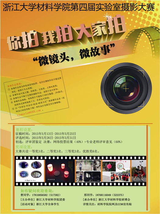 为多角度、全方位的展示浙江大学校园生活,给爱好、擅长摄影的同学提供学习、交流、展示的平台,我校举办主题为“微镜头,微故事”的摄影大赛,现向全校学生征集科研、文体、人物风景等为主题的摄影作品。