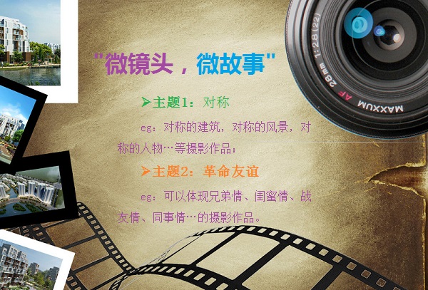 为丰富我院广大学生的课余文化生活,鼓励同学们寻找和发现生活中美好的瞬间,用镜头定格生活,以相片纪念青春;同时给摄影爱好者提供一个学习、交流和展示的平台;我院特举办本次“微镜头,微故事”摄影大赛,现向全校师生征集以“对称”或“革命友谊”为主题的摄影作品。