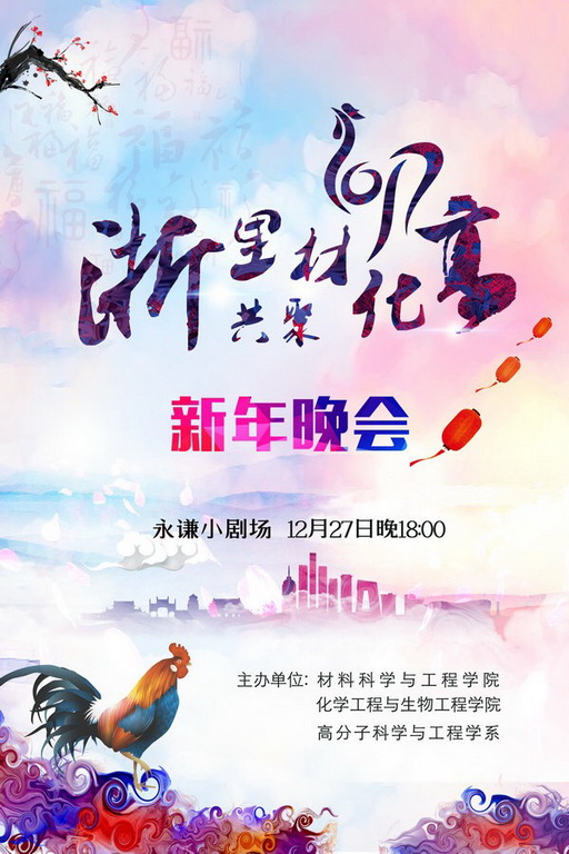 由bwin必赢、化学工程与生物工程学院和高分子科学与工程学系联合举办的“浙里共聚材化高”2017新年晚会将于2016年12月27日(周二)晚18:30在玉泉校区永谦小剧场隆重举行。届时师生共聚一堂,展示青春才艺,另有精彩的互动游戏和激动人心的抽奖环节,欢迎各位师生参加。