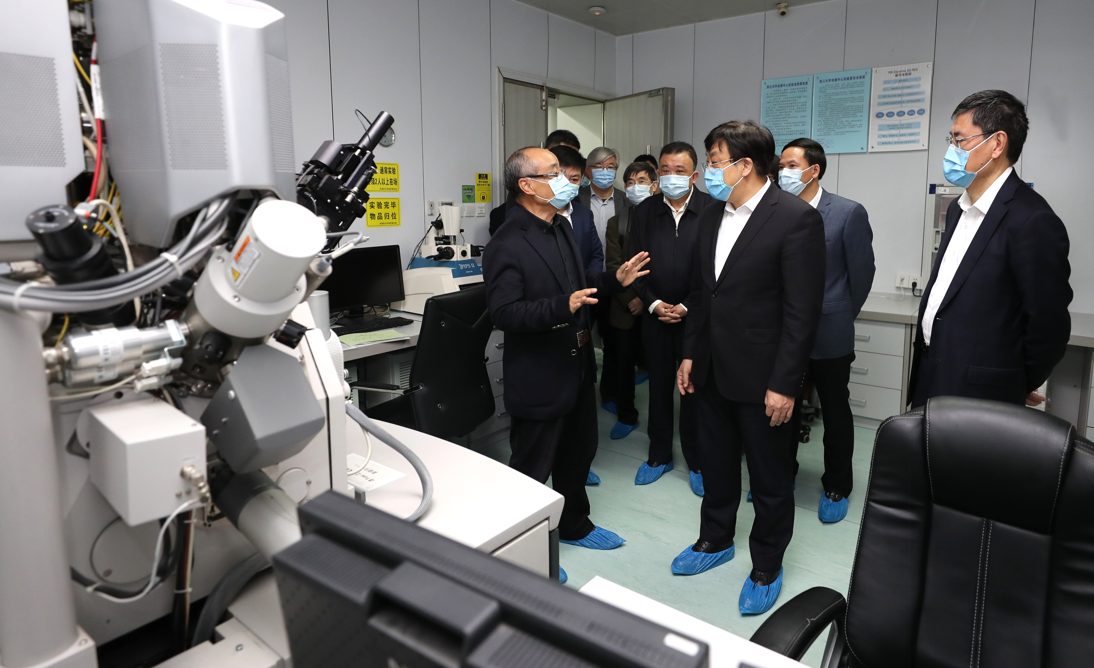 在张泽院士的带领下,冯飞副省长一行首先参观了浙江大学电子显微镜中心。该中心由张泽院士领衔创建,现有高端电子显微镜设备11台,各类相关分析仪器50余台,研究成果已在Nature、Science等国际重要学术期刊发表,为浙江大学材料显微结构研究领域做出了突出贡献。