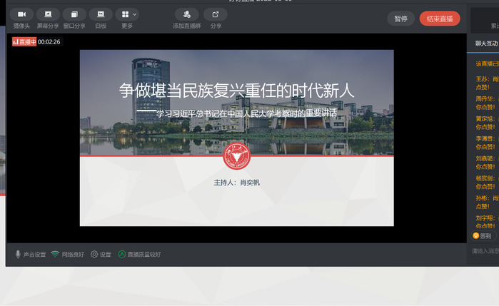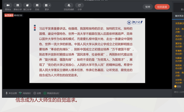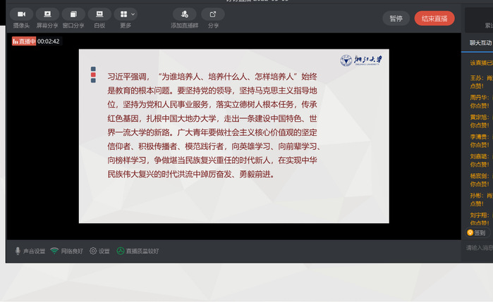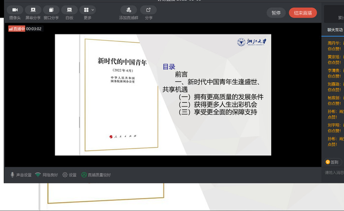 在五四青年节到来之际,习近平总书记来到中国人民大学考察,并深情寄语广大青年。疫情的阻拦磨不灭青年心向党的热忱,5月4日,材料2001支部采取了钉钉线上会议的特殊方式,开展了学习习近平总书记在中国人民大学考察时的重要讲话精神主题团日活动,深刻领会习近平总书记重要讲话精神,掀起学习热潮。会议由团支书肖奕帆同学主持。