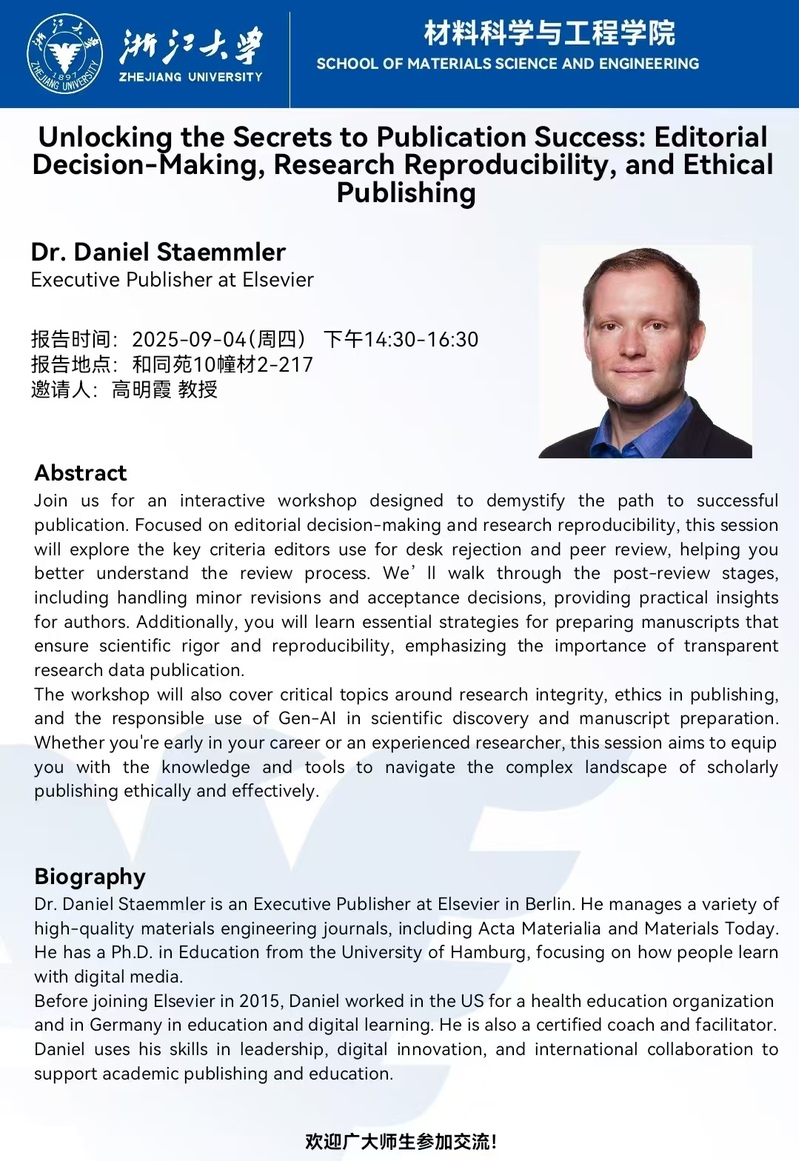 关于Dr. Daniel Staemmler(Executive Publisher at Elsevier)报告的通知