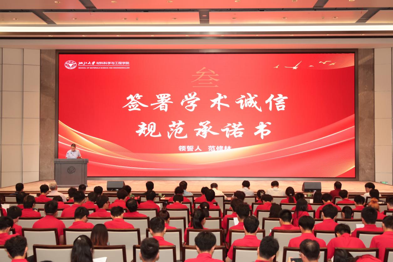 随后,在院长助理范修林研究员的带领下,全体新生庄严宣誓,郑重签署《学术诚信规范承诺书》,承诺坚守学术道德底线,严格恪守科研行为规范,以诚信为本开启学术生涯,展现出浙大材料学子严谨治学的态度与追求。