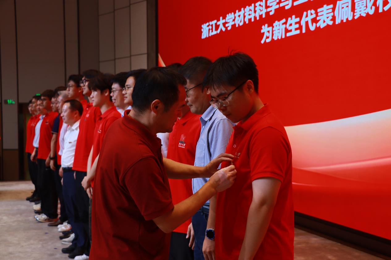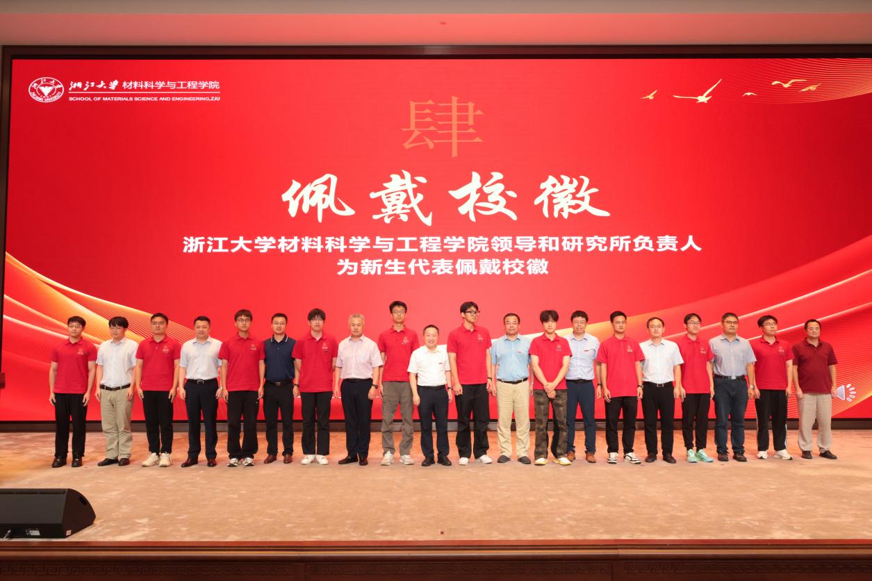 材料学院领导与各研究所负责人共同为新生代表佩戴浙江大学校徽。这枚小小的校徽,不仅是浙大“求是创新”精神血脉的具象载体,更承载着学校百年办学的深厚底蕴。当校徽稳稳别在新生胸前,标志着他们正式成为“浙大材料人”,也象征着他们自此踏上探索材料科学前沿、践行“明德求真,精材成器”院训的学术新征程。