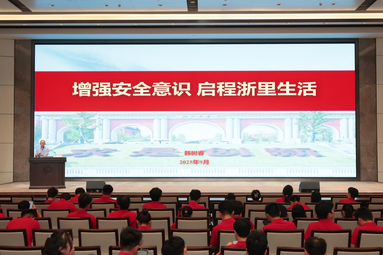 入院仪式第一阶段圆满结束。随后,仪式进入第二阶段议程。浙江大学安保处副处长韩树春以真实案例开篇,为2025级研究生及2024级本科生作专题安全教育报告围绕消防安全、国家安全、实验室安全三大重点领域,结合校园实际场景详细拆解安全规范,明确风险识别与防范要点,提醒全体新生时刻绷紧安全之弦,让安全意识成为科研学习道路上的坚实保障。