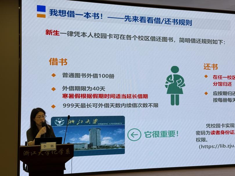 9月23日晚,浙江大学校图书馆情报分析中心的李懿老师为新生同学们作《图书馆资源使用》专题报告。报告重点阐述如何提升文献检索效率,指导新生通过优化关键词组合、筛选核心数据库等方式增强 “信息获取能力”,帮助大家快速定位研究领域关键文献,凸显学术信息筛选的精准度与时效性价值;同时,李懿老师系统介绍了浙大图书馆的资源体系,涵盖中外文电子文献库的分类使用等。这些实用信息为刚迈入研究生阶段的新生搭建了高效科研信息获取路径,切实为其后续开展学术研究提供支撑,筑牢科研入门的信息基础。