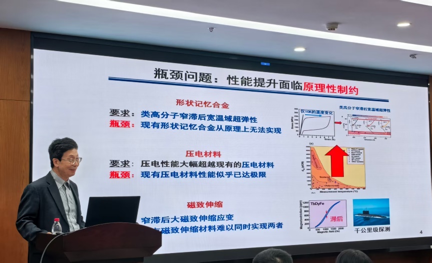 报告伊始,任晓兵教授结合类比了人的大脑感知外界环境驱动向我们介绍了可以感知力、电、磁、温度等外场并产生驱动(位移等)的三类铁性智能功能材料:包含铁弹/形状记忆合金,铁电压电材料,铁磁磁致伸缩材料,他们都符合同一Landau物理框架。而如今智能技术的高速发展背景对智能材料性能提出了前所未有的高要求,基于传统原理的性能提升普遍遭遇到原理性瓶颈,亟待发现能够突破当前原理性瓶颈的新原理,进而获得智能材料的性能突破。