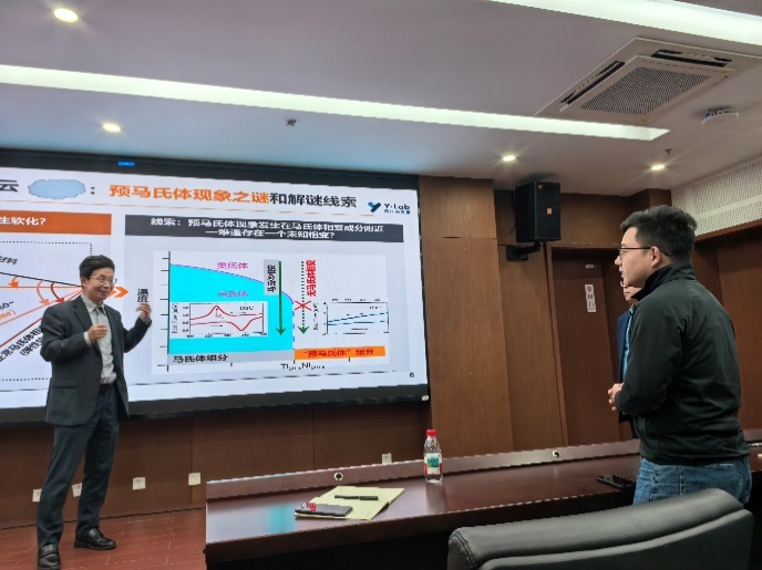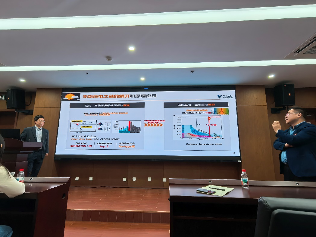 报告结束后的互动环节,朱铁军院长团队成员以及我院现场其他师生踊跃提问,围绕基于经典铁性物理大厦Landau理论任晓兵教授团队开发的新理论,正逆压电效应等问题进行了深入交流,朱铁军院长也根据这些问题向研究生们提出了很多建议,现场学术氛围浓厚,听众纷纷表示受益匪浅。