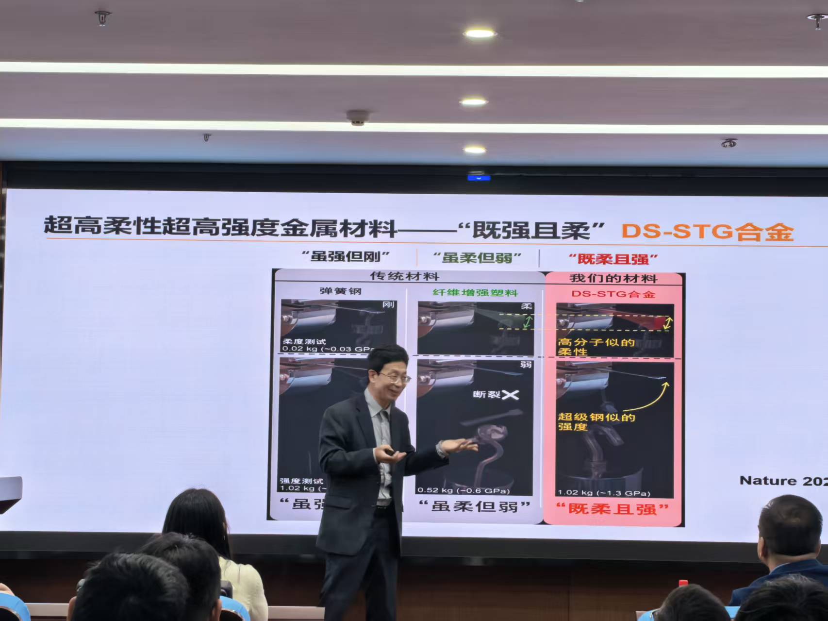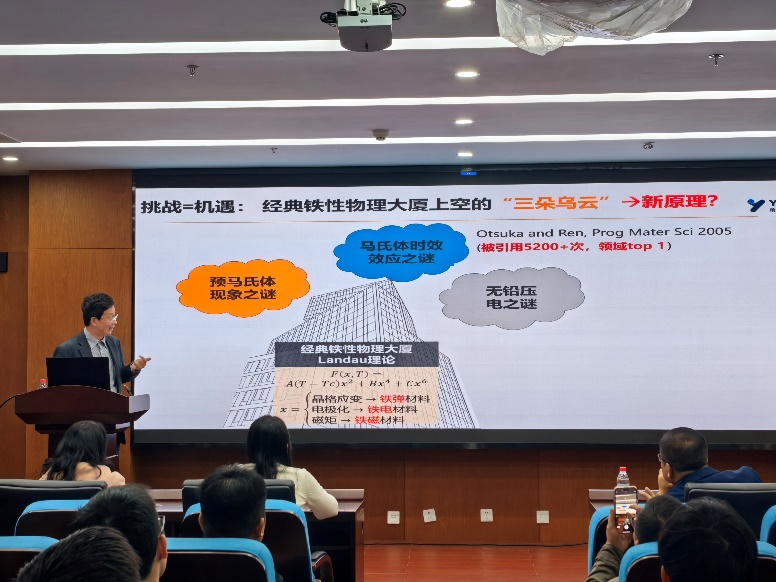 接下来任晓兵教授提出了“经典铁性物理大厦上空的‘三朵乌云’”:预马氏体现象之谜、马氏体时效效应之谜、无铅压电之谜。并针对这三朵乌云提出了团队的研究方法与成果。针对预马氏体现象之谜,任晓兵教授团队发现XRD/DSC看不见的纳米级相变可以用DMA检测出来,发现了晶体中的非晶现象,开辟了应变玻璃的新领域方向,开发出了超高柔性超高强度金属材料DS-STG合金(Nature 2024);针对马氏体时效效应之谜,任晓兵教授团队利用逆向思维,发现了XRD、TEM看不见的微观对称性变化(SC-SRO),发现了点缺陷短程有序对称性原理,开发出了巨电致应变效应(PZT ZT的40倍),该成果荣获国家自然科学二等奖;针对无铅压电之谜,任晓兵教授团队发现了三临界多相共存点处为性能珠峰,开发出了超高压电效应陶瓷(压电之王PZT的10-30倍)(science,in revision 2025)。